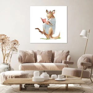 - Obraz przedstawia kangurzycę w pastelowych odcieniach czytającą książkę wspólnie z dzieckiem. Urocza ilustracja idealna do dekoracji pokoju dziecięcego, wprowadzająca ciepło i przytulność.