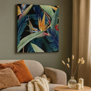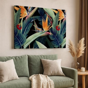 Obraz na płótnie - Tropikalne kwiaty i liście na czarnym tle - 160x50cm - Płomienne kwiaty tropików - Nowoczesna dekoracja ścienna do salonu i sypialni ARTTOR