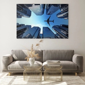 Obraz na szkle zatytułowany "Widok ze szklanego wąwozu" ukazuje dynamiczną scenę z lotem samolotu między imponującymi drapaczami chmur. Ten nowoczesny pejzaż architektoniczny przyciąga uwagę swoją przestrzennością oraz wyjątkowym kontrastem między lśniącymi szklanymi fasadami budynków a błękitnym niebem. To ujęcie oddaje zarówno ruch, jak i harmonię miejskiego życia.