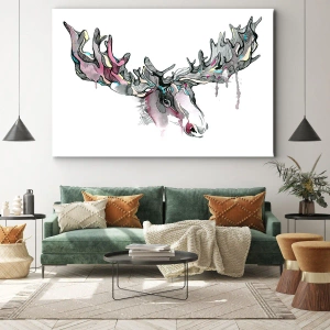 - Obraz na płótnie przedstawia artystyczną akwarelę łosia z bogatym porożem. Subtelne detale i wyrazista kompozycja nadają dziełu elegancji i lekkości.