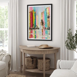 - Plakat przedstawiający kobietę spacerującą wśród kolorowych budynków w impresjonistycznym stylu. Żywe barwy i artystyczny wyraz sprawiają, że to idealna dekoracja do nowoczesnych wnętrz.