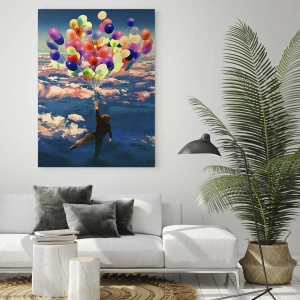 Obraz na szkle - Postać unoszona w przestworzach przez kolorowe balony - 50x70cm - Spełnione marzenie dzieciństwa - Nowoczesna dekoracja ścienna do salonu, kuchni i sypialni ARTTOR