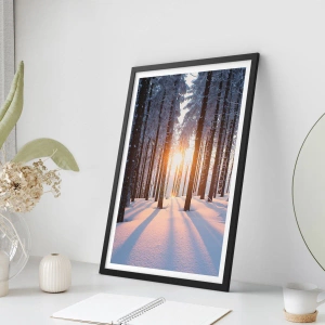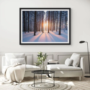 Plakat w czarnej ramie - Zimowy las oświetlony promieniami słońca - 70x50cm - Wyraźnie czarno na białym - Nowoczesna dekoracja ścienna do salonu i sypialni ARTTOR