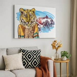 Obraz na płótnie - Tygrys w płaszczu na tle górskiego krajobrazu - 70x50cm - Nie taki dziki jak go rysują - Nowoczesna dekoracja ścienna do salonu i sypialni ARTTOR