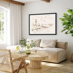 Plakat w czarnej ramie - Szkic latarni morskiej z widokiem na morze - 70x50cm - Zarys wspomnienia lata - Nowoczesna dekoracja ścienna do salonu i sypialni ARTTOR
