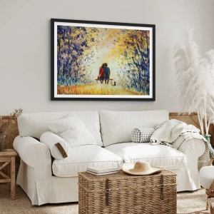 Plakat w czarnej ramie - Para siedząca na ławce wśród jesiennych barw o zachodzie słońca - 50x70cm - Magiczna chwila - Nowoczesna dekoracja ścienna do salonu i sypialni ARTTOR