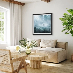 Plakat w czarnej ramie - Jeleń w porannej mgle w lesie - 50x70cm - Poranny obchód włości - Nowoczesna dekoracja ścienna do salonu i sypialni ARTTOR