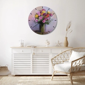 - Okrągły zegar ścienny z motywem bukietu róż w kolorowym wazonie na pastelowym tle. Elegancki i stylowy dodatek do każdego wnętrza, wprowadzający harmonię.