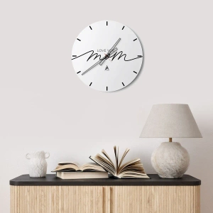 - Artystyczny zegar ścienny 30x30 cm z eleganckim napisem Love You Mom na białym tle. Wykonany na szkle w formacie okrągłym. Idealny jako prezent dla mamy oraz do wnętrz pełnych ciepła i elegancji.