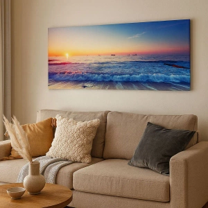 Obraz na płótnie - Zachód słońca nad morzem z falami u brzegu - 50x70cm - A co za horyzontem? - Nowoczesna dekoracja ścienna do salonu, kuchni i sypialni ARTTOR