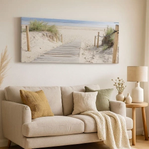 Obraz na płótnie - Drewniana ścieżka na plaży prowadząca do morza - 50x70cm - Po horyzont - Nowoczesna dekoracja ścienna do salonu, kuchni i sypialni ARTTOR