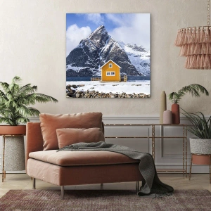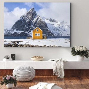 - Obraz przedstawiający żółty domek na tle zaśnieżonych gór i spokojnego morza. Klimatyczny krajobraz o wyjątkowym kontraście kolorystycznym wprowadza harmonię i inspirację do każdego wnętrza. Idealny wybór dla miłośników przyrody.