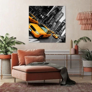 Obraz na płótnie "Żółte taksówki w Nowym Jorku" przedstawia dynamiczną scenę miejskiego życia, gdzie żółte taksówki przemierzają ruchliwe skrzyżowanie. Intensywny żółty kolor pojazdów doskonale kontrastuje z monochromatycznym tłem, przyciągając uwagę i nadając zdjęciu niezwykłej energii.