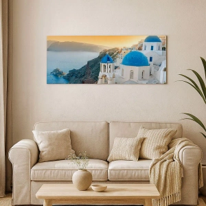 Obraz "Santorini - perła Morza Egejskiego" doskonale sprawdzi się jako dekoracja w salonie, jadalni lub sypialni, nadając wnętrzu elegancji i wprowadzając atmosferę wakacyjnego relaksu.