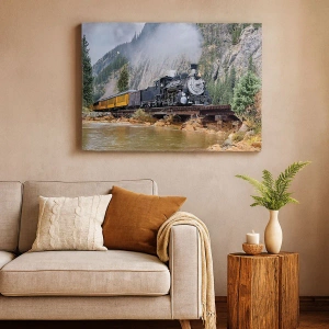 Obraz na płótnie - Parowóz na moście w malowniczym górskim krajobrazie - 140x50cm - A dokąd to? Dokąd? - Nowoczesna dekoracja ścienna do salonu i sypialni ARTTOR