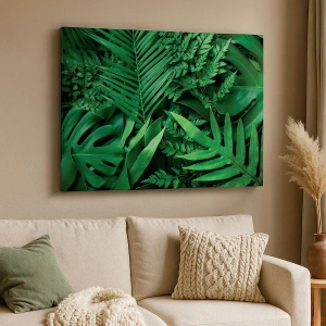 Obraz na ścianę - Utulone w zieleni - Zielone liście tropikalne w gęstej i naturalnej kompozycji