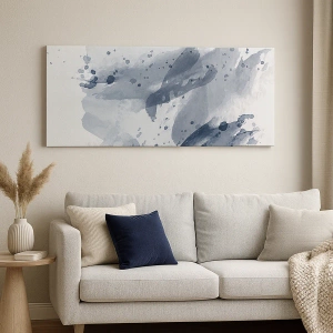 - Obraz przedstawia abstrakcyjne plamy w odcieniach niebieskiego na jasnym tle. Minimalistyczna kompozycja dodaje wnętrzom spokoju i elegancji.