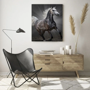 - Dynamiczny obraz przedstawiający galopującego konia na tle ciemnej sceny z efektem światła. Wyrazista kompozycja idealna do nowoczesnych wnętrz.