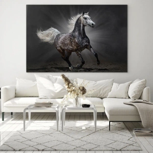 Obraz na ścianę - Szare jest piękne - Galopujący koń na tle ciemnej sceny z efektem światła