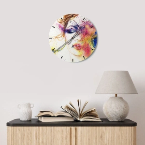 - Zegar ścienny z abstrakcyjnym portretem kobiety w tęczowych barwach. Idealny dla miłośników sztuki i oryginalnych dekoracji, wnosi do wnętrz harmonię i artystyczny wyraz.