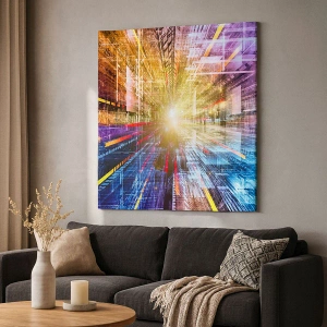 Obraz na płótnie - Abstrakcyjna wizja futurystycznego miasta z promieniami światła - 50x70cm - Świetlny korytarz - Nowoczesna dekoracja ścienna do salonu, kuchni i sypialni ARTTOR