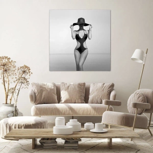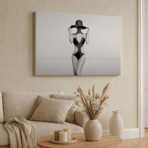 Obraz na płótnie - Stylowa kobieta w czarnym stroju kąpielowym i kapeluszu - 50x70cm - Na imię mi: Elegancja - Nowoczesna dekoracja ścienna do salonu, kuchni i sypialni ARTTOR
