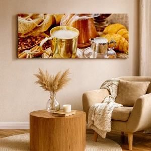 Obraz na płótnie - Złoty kubek z gorącą kawą otoczony ziarnami i miedzianymi akcesoriami - 50x70cm - Miłego dnia! - Nowoczesna dekoracja ścienna do salonu, kuchni i sypialni ARTTOR