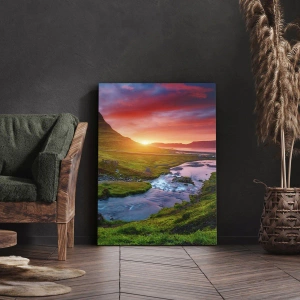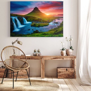 Obraz na płótnie - Malowniczy wodospad i góra o zachodzie słońca - 70x50cm - Islandia - ogień i woda - Nowoczesna dekoracja ścienna do salonu i sypialni ARTTOR