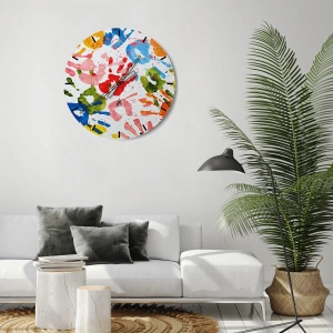 Zegar ścienny - Kolorowe odciski dłoni na białym tle - 30x30cm - Idź po śladach - Nowoczesna dekoracja ścienna do salonu i sypialni ARTTOR