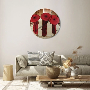 - Okrągły zegar ścienny o wymiarach 30x30 cm przedstawiający trzech mnichów w czerwonych szatach z parasolkami. Idealny do wnętrz o orientalnym lub nowoczesnym charakterze.