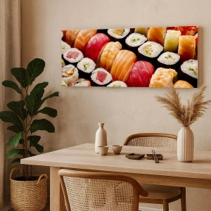 Obraz na płótnie - Kolorowa kompozycja sushi z różnorodnymi dodatkami - 50x70cm - Barwy i smaki Azji - Nowoczesna dekoracja ścienna do salonu, kuchni i sypialni ARTTOR