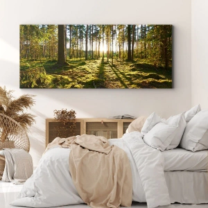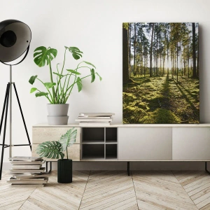 Obraz na płótnie - Las iglasty oświetlony promieniami słońca - 50x70cm - …Za siedmioma lasami - Nowoczesna dekoracja ścienna do salonu, kuchni i sypialni ARTTOR