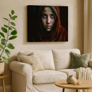 Obraz na płótnie - Portret kobiety o hipnotyzujących oczach w czerwonej chuście - 50x70cm - Wschodnia księżniczka - Nowoczesna dekoracja ścienna do salonu, kuchni i sypialni ARTTOR