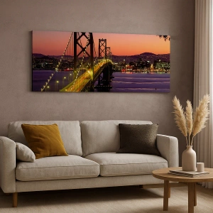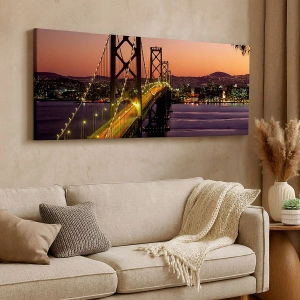 "Wieczór we fiolecie" to wyjątkowy obraz na płótnie ukazujący majestatyczny most podświetlony nocą, rozciągający się nad spokojnymi wodami rzeki. W tle widoczna jest panorama miasta rozświetlona tysiącami świateł, tworząc niezapomniany widok. Kolory zachodu słońca nadają scenie ciepły, nastrojowy charakter, który przyciąga wzrok i wprowadza romantyczny klimat do wnętrza.