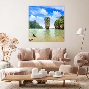 Motyw formacji skalnej na tle tropikalnego krajobrazu symbolizuje harmonię i spokój, czyniąc ten obraz idealnym wyborem do wnętrz sprzyjających relaksowi. Dzięki starannemu odwzorowaniu detali, intensywnym barwom i realistycznej perspektywie obraz wprowadza atmosferę odprężenia i inspiracji.