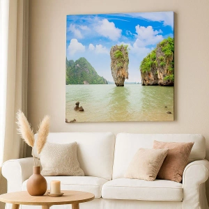 Obraz na ścianę - Skalne dziwy natury - Egzotyczna formacja skalna otoczona wodą i zielenią pod błękitnym niebem