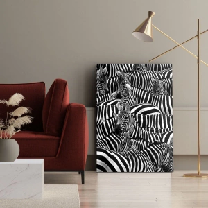 Obraz na płótnie "Portret zbiorowy w paski" ukazuje fascynujący widok grupy zebr, których czarno-białe wzory tworzą hipnotyzujący wzór. Geometryczna harmonia pasków przyciąga wzrok, wprowadzając elegancję i symetrię do każdego wnętrza. Kontrast pomiędzy czernią a bielą nadaje kompozycji wyrazistości i artystycznego charakteru.
