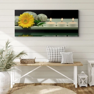Obraz na płótnie - Żółty kwiat, świece i kamienie na tle wody - 120x80cm - Ukojenie zmysłów - Nowoczesna dekoracja ścienna do salonu, kuchni i sypialni ARTTOR