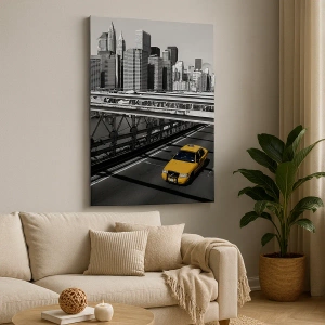 - Czarno-biały widok na panoramę Nowego Jorku z żółtą taksówką na moście. Idealny akcent dekoracyjny dla miłośników miejskiego stylu i nowoczesnych wnętrz.