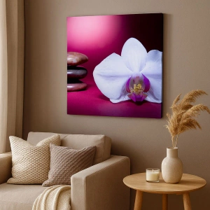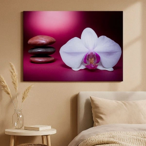 - Delikatna biała orchidea i ułożone kamienie na różowym tle tworzą kompozycję idealną do wnętrz sprzyjających relaksowi i harmonii. Doskonały akcent dekoracyjny inspirowany naturą.