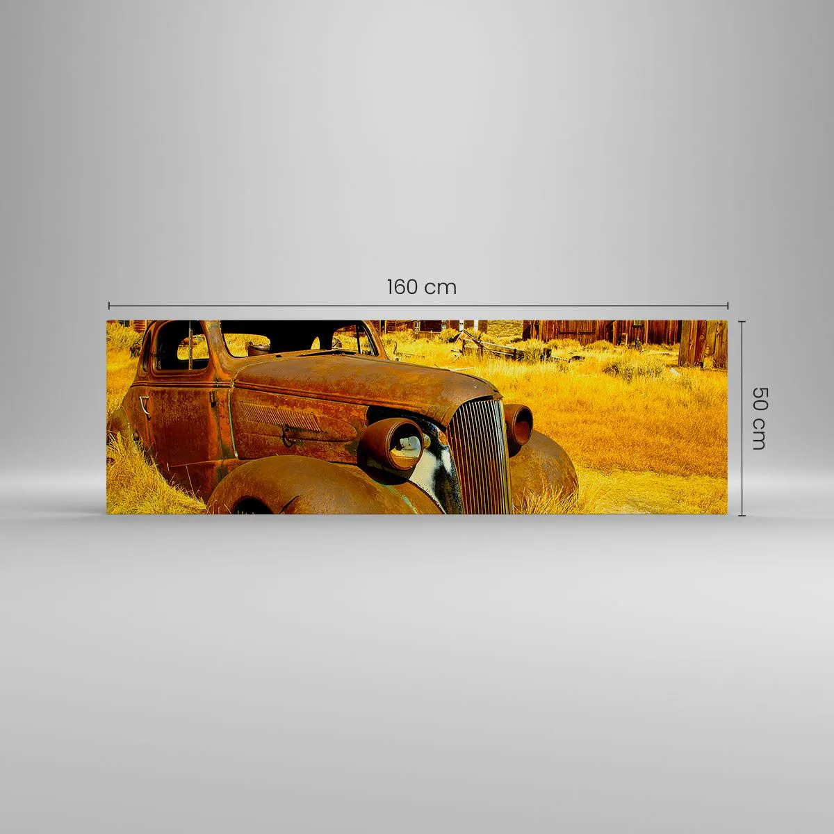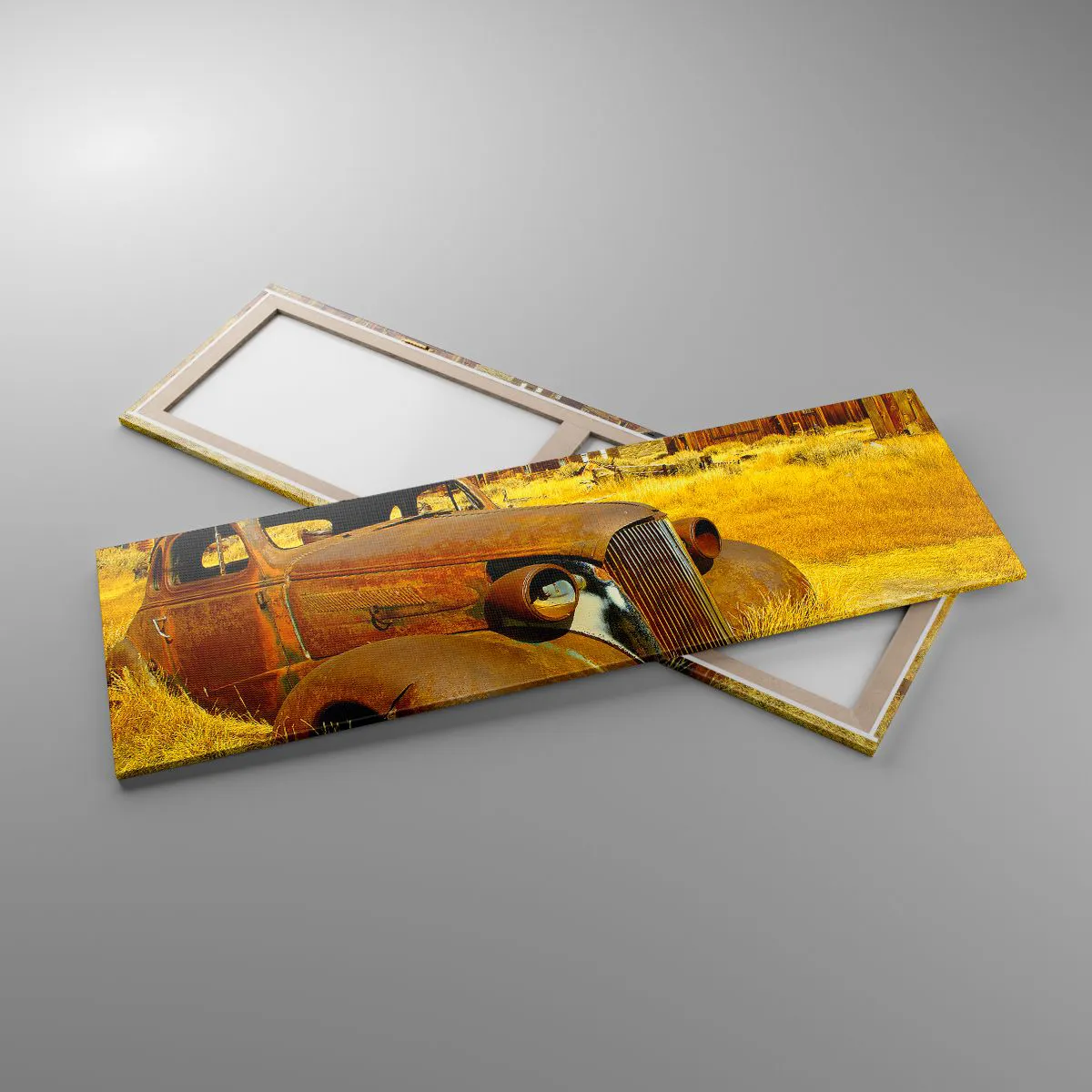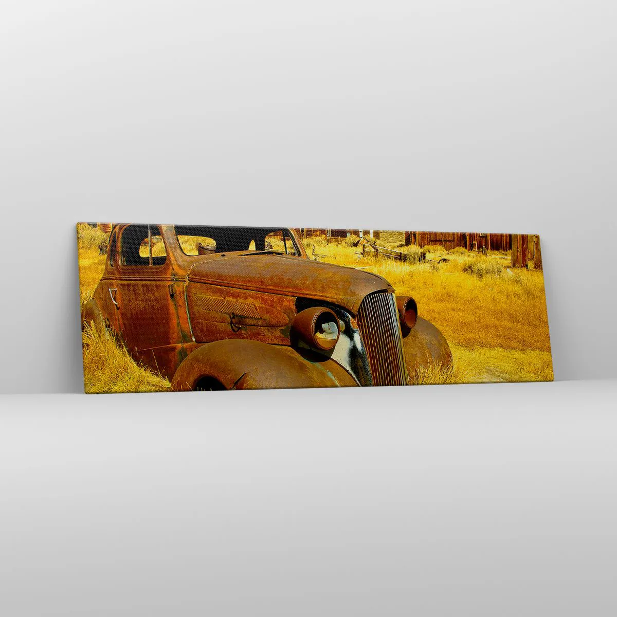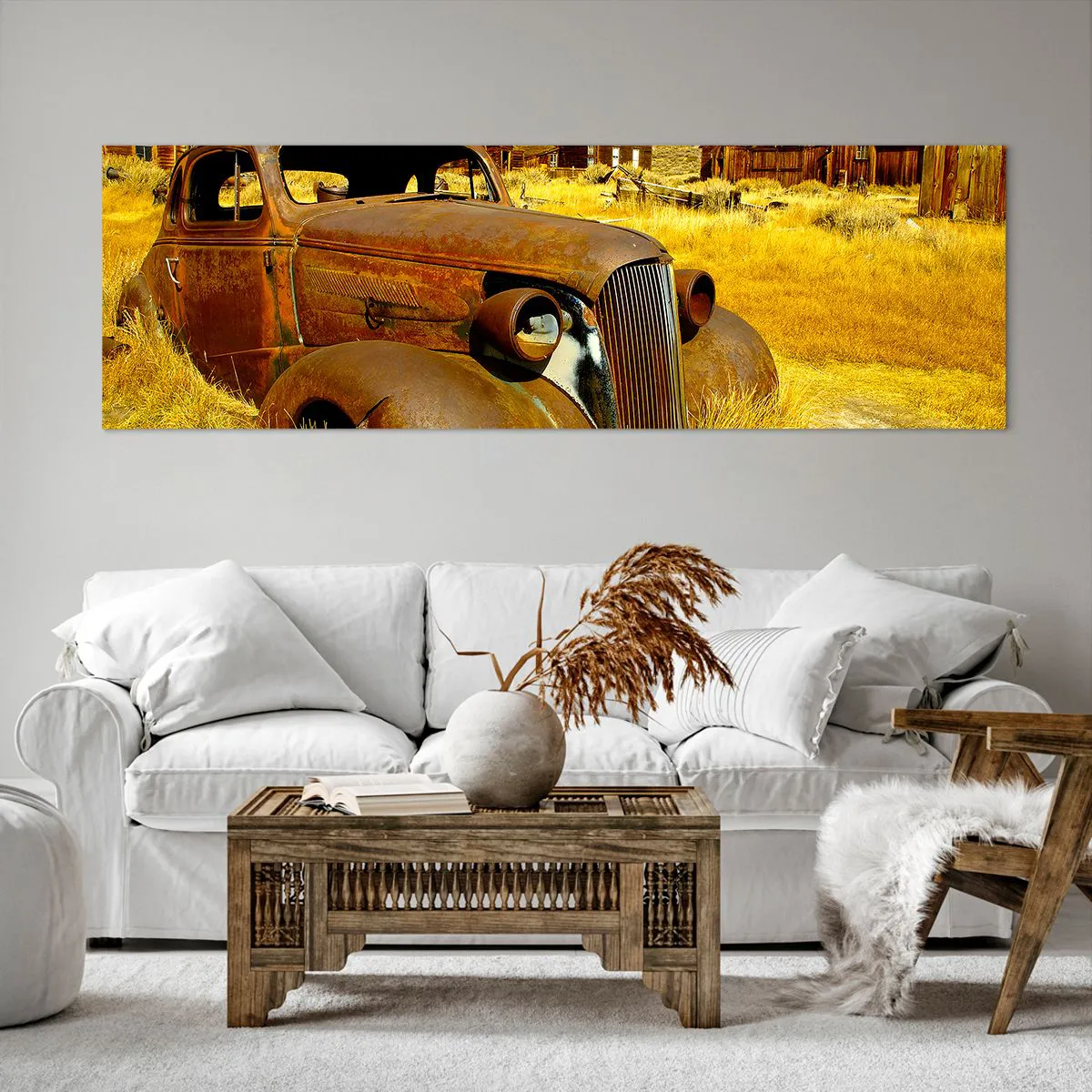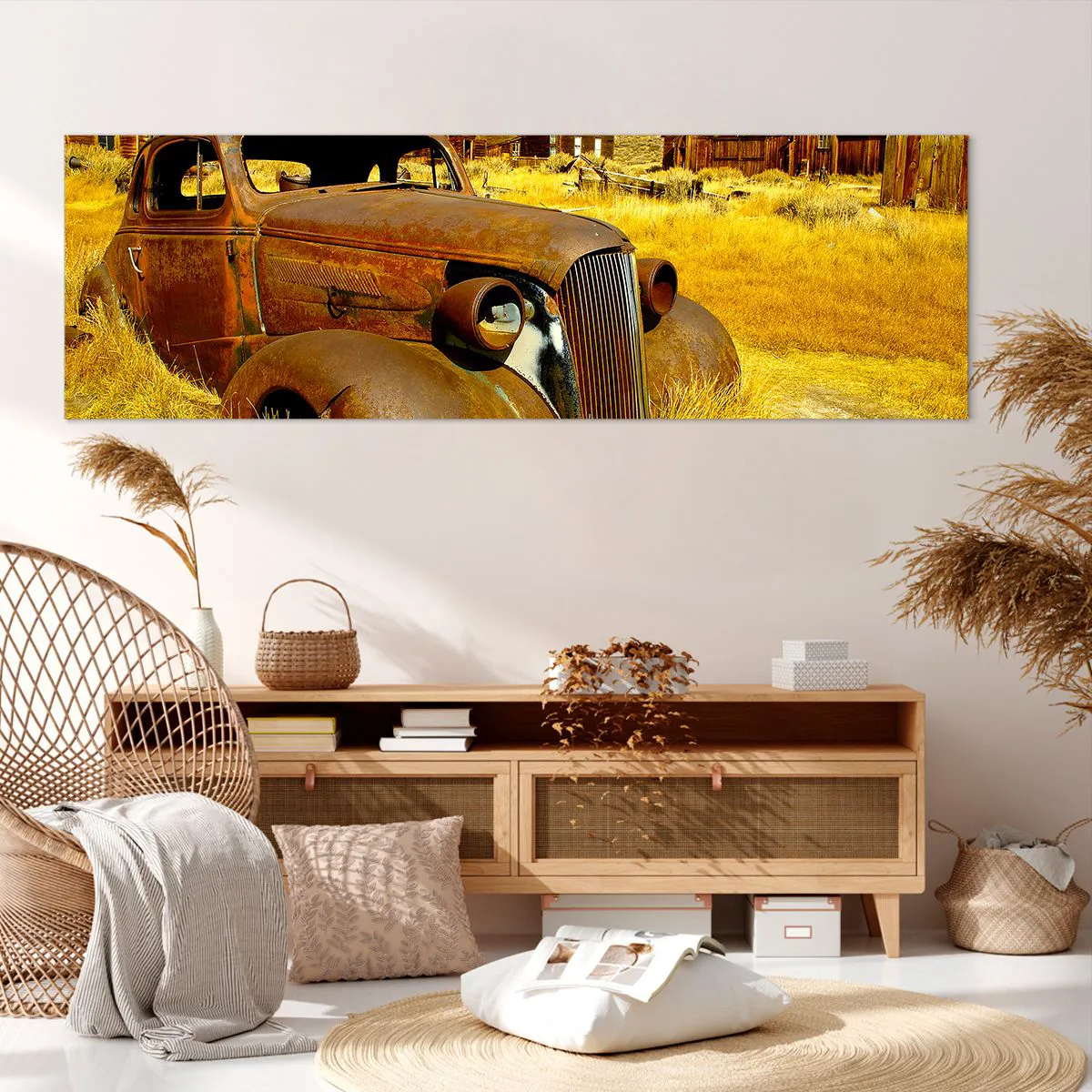 Obraz na płótnie - Stary zardzewiały samochód na tle opuszczonych drewnianych chat - 160x50cm - Zasłużony odpoczynek - Nowoczesna dekoracja ścienna do salonu i sypialni ARTTOR