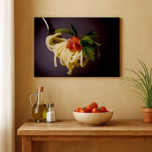 „Smakowity kęs” to wyjątkowy obraz na płótnie przedstawiający elegancko podany makaron spaghetti na widelcu z sosem pomidorowym i natką pietruszki. Idealnie komponuje się w kuchniach oraz jadalniach, dodając wnętrzom apetyczny i stylowy akcent kulinarny.