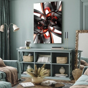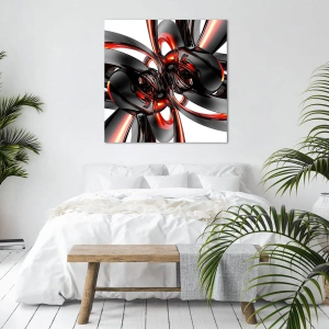 Motyw abstrakcji podkreśla kreatywność i innowacyjność, a kontrast pomiędzy czernią a czerwienią przyciąga wzrok, tworząc unikalny efekt wizualny. Obraz ten stanowi doskonały wybór dla osób ceniących sztukę współczesną, design oraz nietuzinkowe dekoracje ścienne. Wprowadza nowoczesność i harmonię do każdego wnętrza.