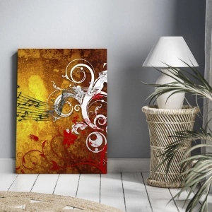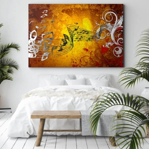 "Niech płynie muzyka" to niezwykły obraz na płótnie ukazujący abstrakcyjne nuty muzyczne na tle w ciepłych barwach żółci i pomarańczu. Dekoracyjne ornamenty i artystyczne detale podkreślają inspirację muzyką i sztuką, tworząc harmonijną kompozycję pełną rytmu i inspiracji.