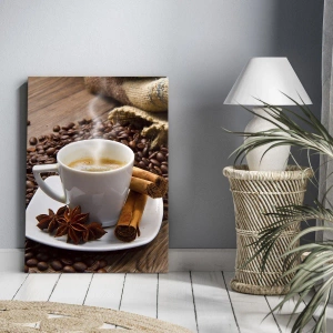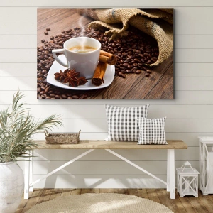Obraz na płótnie - Filiżanka kawy z cynamonem i anyżem na tle ziaren kawy - 100x70cm - Korzenny smak i aromat - Nowoczesna dekoracja ścienna do salonu, kuchni i sypialni ARTTOR