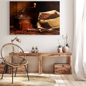 Obraz został wykonany na płótnie klasy Premium, co zapewnia wysoką jakość i trwałość. Jego poziomy format o wymiarach 70x50 cm doskonale nadaje się do kuchni, jadalni, kawiarni lub salonu. Precyzyjnie odwzorowane tekstury drewna, metalu i ziaren kawy nadają głębi i naturalnego uroku całej scenie.