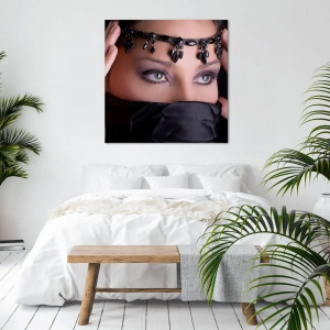 "Orientalna kusząca tajemnica" to elegancki obraz ukazujący subtelny portret kobiety z ozdobną biżuterią na tle głębokiej czerni. Motyw ten emanuje tajemniczością, zmysłowością i elegancją, dodając wnętrzom wyjątkowego stylu i klasy. Detale biżuterii przyciągają wzrok, tworząc efekt luksusu i artystycznego wyrazu.