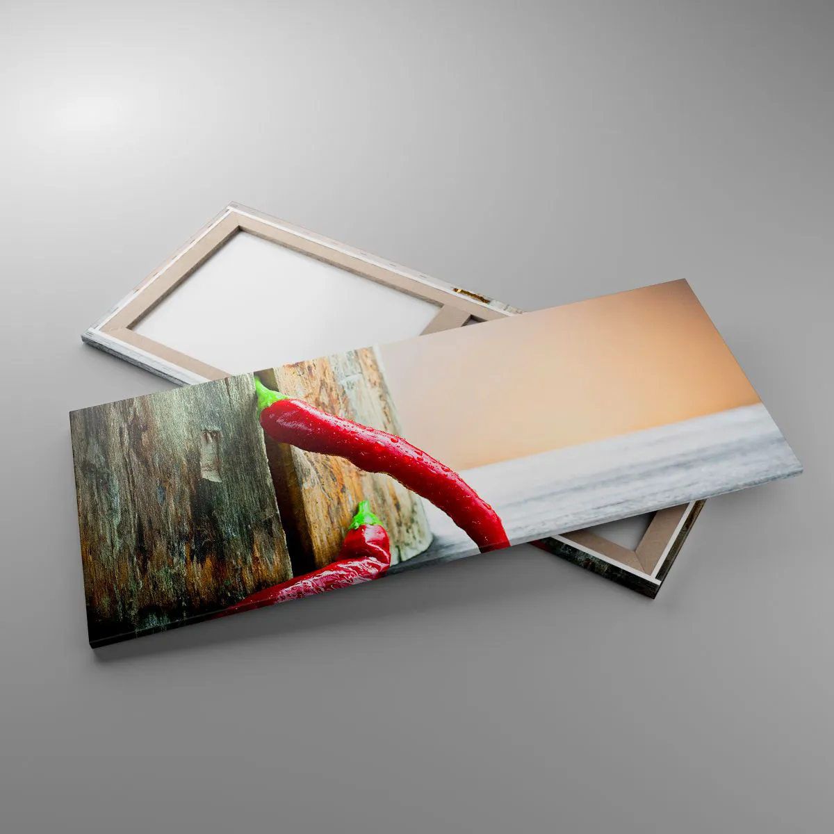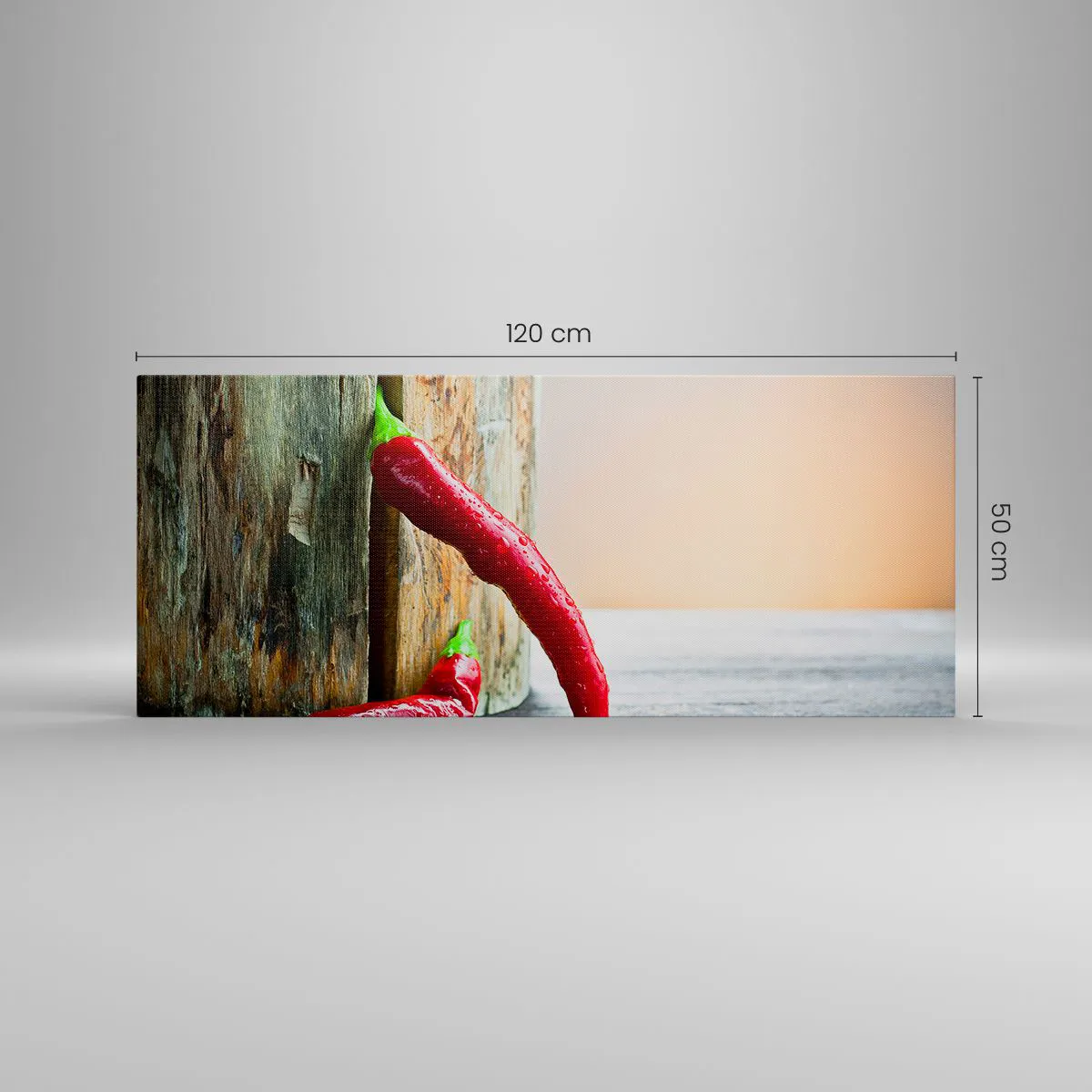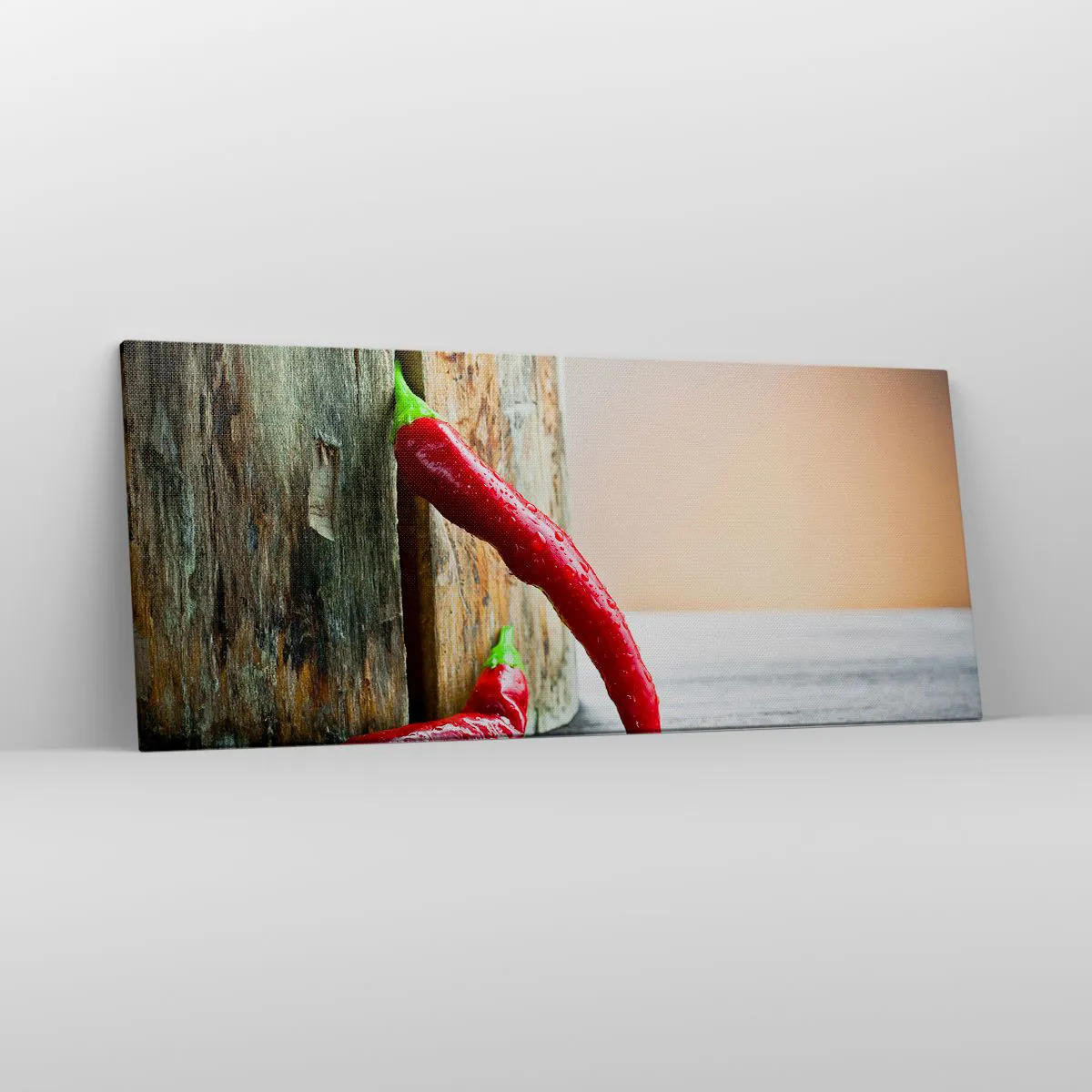 Obraz na płótnie - Dwie czerwone papryczki chili na drewnianym tle z rustykalnym akcentem - 120x50cm - Red hot chili peppers - Nowoczesna dekoracja ścienna do salonu i sypialni ARTTOR