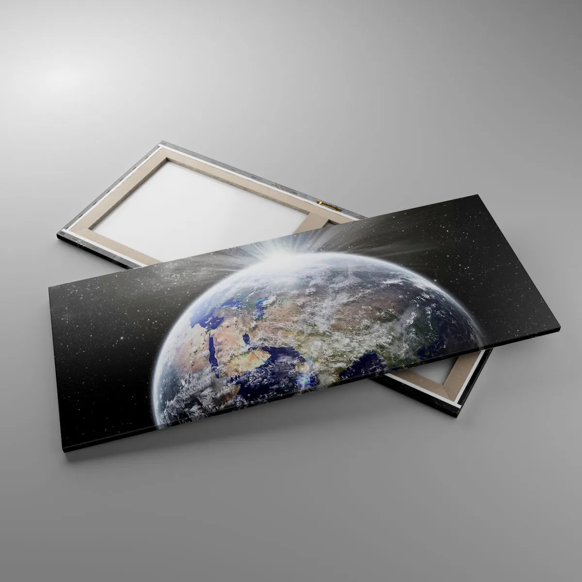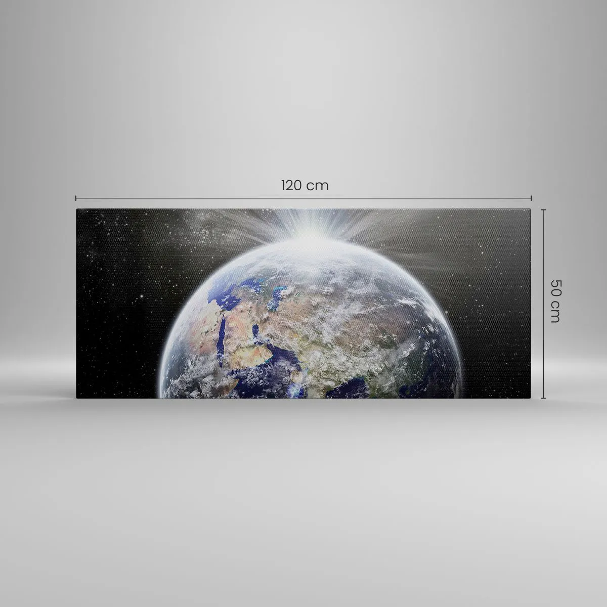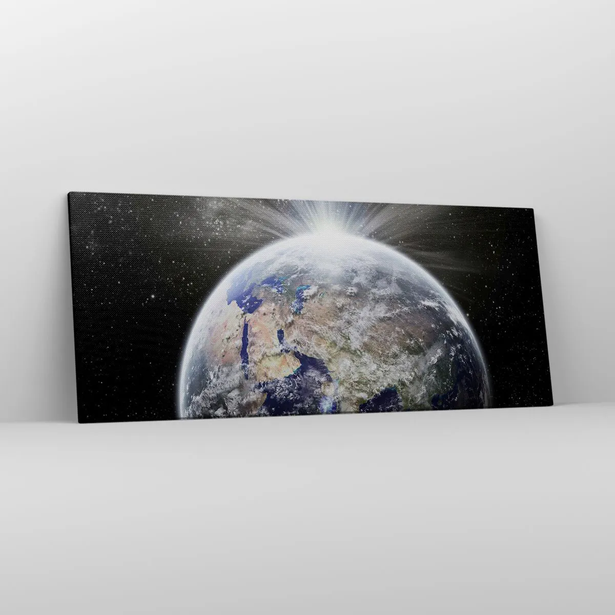 Obraz na płótnie - Ziemia i Księżyc oświetlone blaskiem w kosmosie - 120x50cm - W pełnym blasku - Nowoczesna dekoracja ścienna do salonu i sypialni ARTTOR