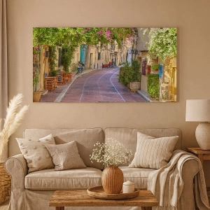 - Obraz przedstawia malowniczą uliczkę ozdobioną kwitnącymi pnączami i urokliwymi kawiarnianymi stolikami. Doskonała dekoracja do wnętrz, wprowadzająca śródziemnomorski klimat i romantyczny nastrój.